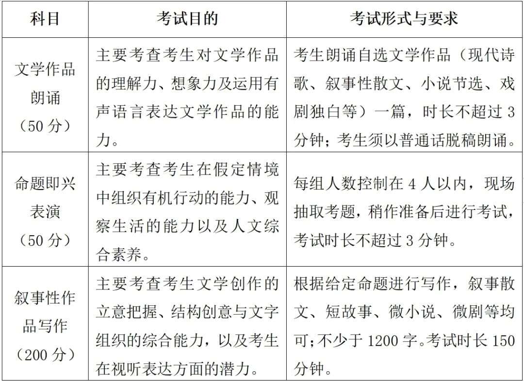 考试内容:考试包括文学作品朗诵(50分)、命题即兴表演(50分)、叙事性作品写作(200分)三个科目,总分为300分。具体考试形式和要求如下: