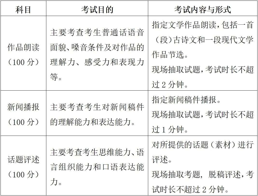 考试内容:考试包括作品朗读(100分)、新闻播报(100分)、话题评述(100分)三个科目,总分为300分。具体考试形式和要求如下: