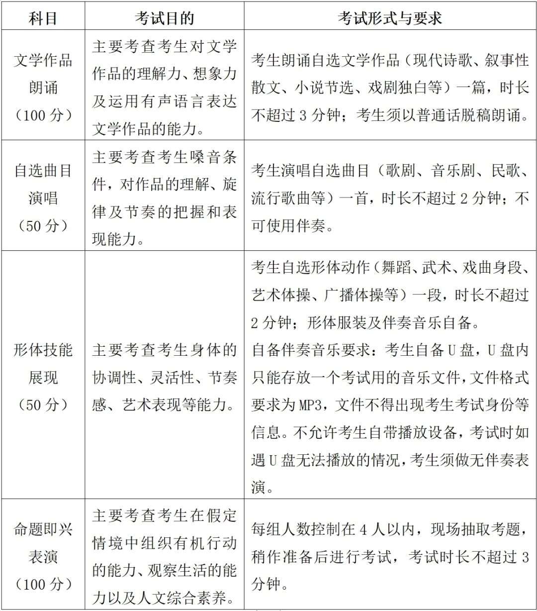 考试内容:考试包括文学作品朗诵(100分)、自选曲目演唱(50分)、形体技能展现(50分)、命题即兴表演(100分)四个科目,总分为300分。具体内容形式和要求如下: