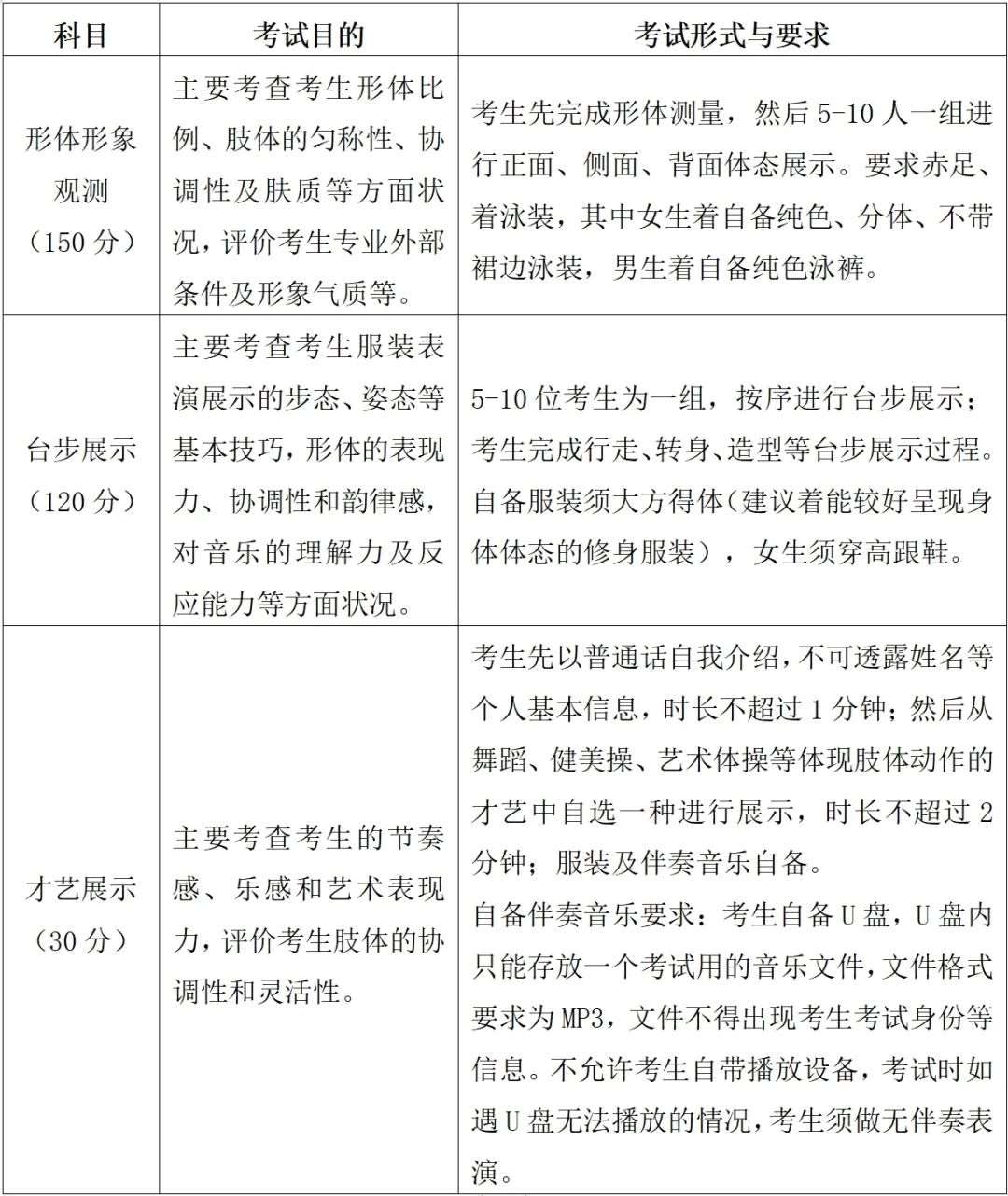 考试内容:考试包括形体形象观测(150分)、台步展示(120分)、才艺展示(30分)三个科目,总分为300分。具体考试形式和要求如下: